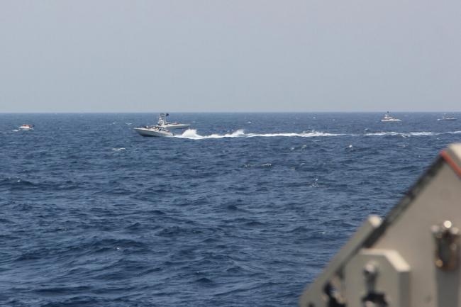 2021年,一艘伊朗革命卫队海军的近岸快速攻击艇(一种配备机枪的快艇)接近正在穿越霍尔木兹海峡的美国海军舰艇。图像由美国海军提供。Navcent Public Affairs/U.S. Navy, via Associated Press