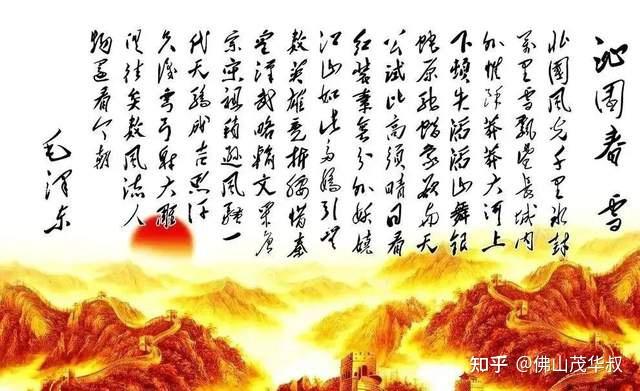 江山如此多娇,引无数英雄竞折腰。惜秦皇汉武,略输文采;唐宗宋祖,稍逊风骚。一代天骄,成吉思汗,只识弯弓射大凋。俱往矣,数风流人物,还看今朝。