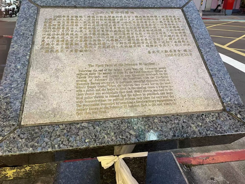 终于一个老头从商店里走出来,把我俩带到了那块碑的跟前。老太太和我面面相觑,甚是尴尬。其实,我们已经与那块立于一个街角的碑擦肩而过数次,但谁也没有察觉到那块不起眼的石板就是我们苦苦寻找的二二八原址纪念碑。显然,我俩都被先入为主的预设所误导,认定如此重大历史事件的ground zero纪念碑应该是伟岸不容错过的,一心去做相应的模式匹配。