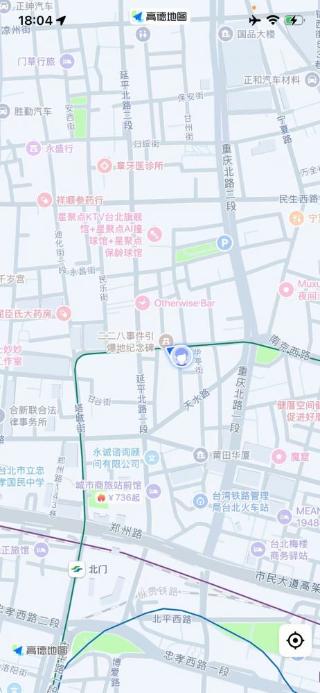 出发之前,我打开了手机里装的高德地图,输入了事发地址南京西路,高德地图立即给出了228事件爆发处纪念碑的具体位置。不用我费心去仔细读地图,毕竟是台湾历史上,定义岛陆关系,乃至中台日三角关系的里程碑事件嘛。但万万没有让我想到的是,当我用导航软件到达纪念碑位置,发现周边是一个台北典型的商业区,既没有纪念碑的踪影也没有任何指示路标。我又犁地一般把周边几个街区遍历了一遍,死活也找不到地图里那座二二八事件爆发地纪念碑。