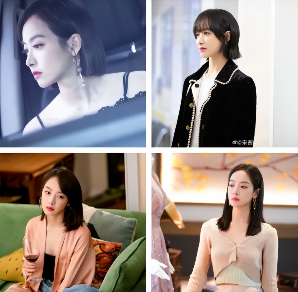 比如宋茜,她只要在现代剧中都是标准的偏分中短发造型,搭配上干练简约的职场装,给人一种成熟、知性又大方的女强人气质。