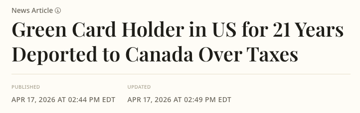 据4月17日报道,一名在美国居住长达21年的加拿大籍绿卡持有者,最近因税务相关刑事定罪被美国移民及海关执法局(ICE)拘留,现已被遣返回加拿大。