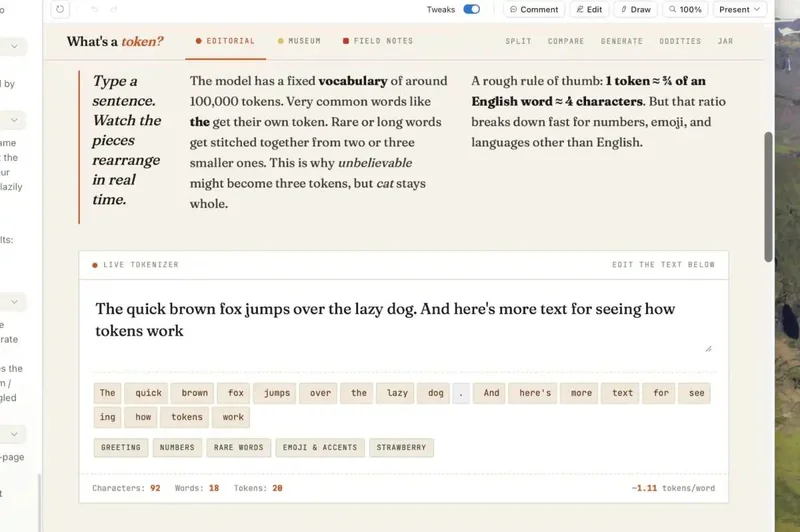 Claude Design生成的AI Tokens科普网页中,可查看Token拆分效果的交互式演示模块(图源:PCWorld)