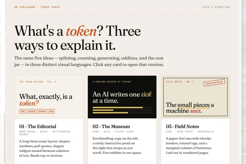PCWorld记者实测中,Claude Design生成的AI Tokens科普网页原型总览(图源:PCWorld)