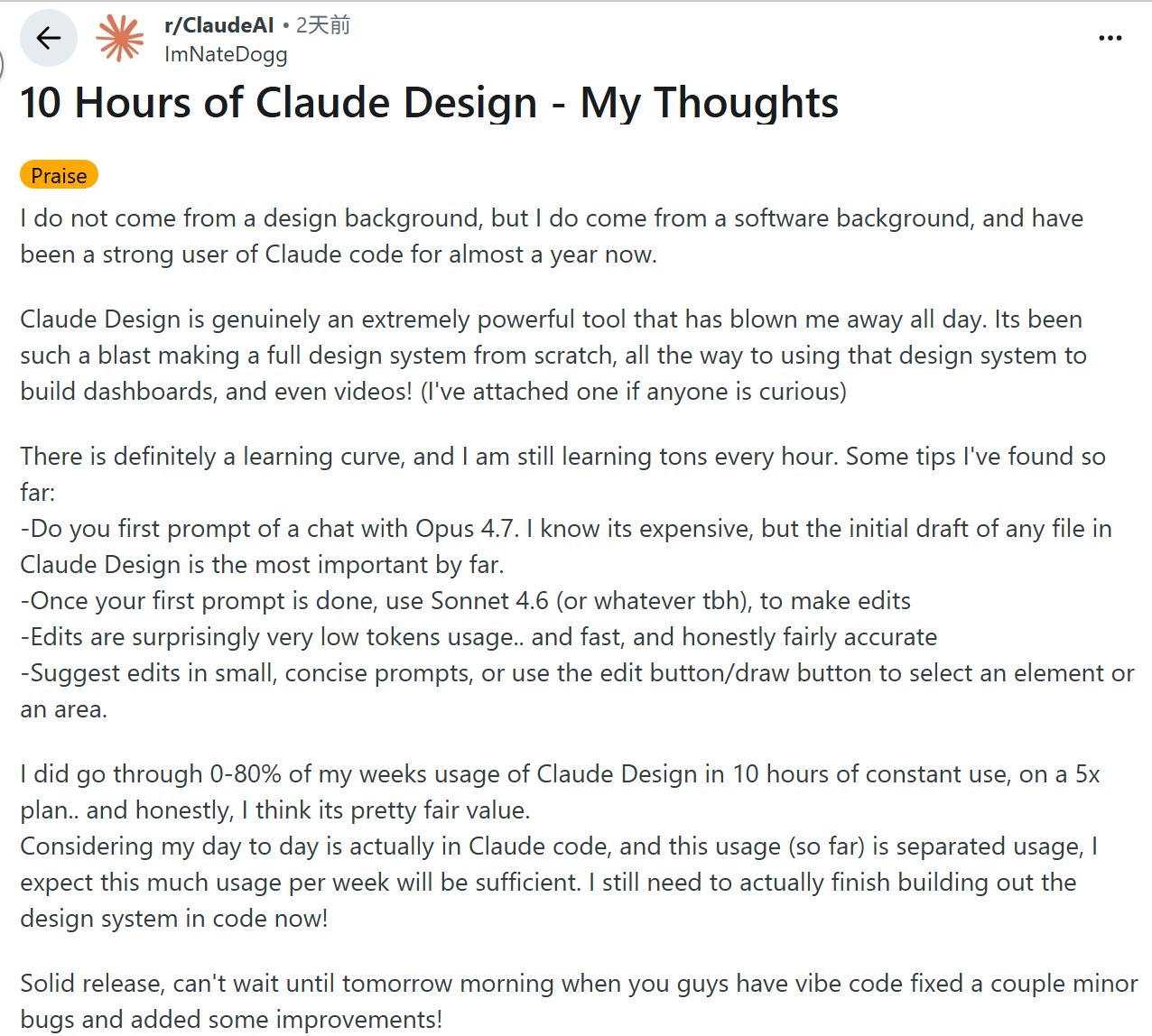 Reddit社区里,有经验的用户给出了更务实的Claude Design用法建议。4月18日,一名深度使用Claude Code近一年、有软件开发背景的用户分享了自己连续使用Claude Design十小时的体验,并总结了几条节省配额的心得: