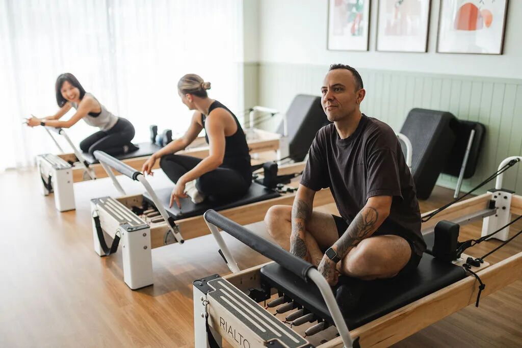 透过玻璃窗,能看到一排排整齐的、被称为“Reformer”的普拉提床,以及一群穿着莫兰迪色系紧身衣、正优雅地拉伸肢体的女性。