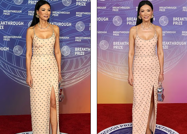 现年57岁的邓文迪(Wendi Deng Murdoch)以一袭裸色镶银饰长裙亮相红毯,裙摆开叉处露出银色高跟鞋,搭配简约却醒目的银色耳环和项链,整个人显得格外纤细骨感,气场十足,成为当晚最受关注的女性嘉宾之一。