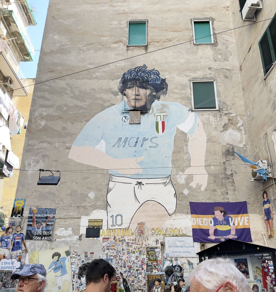 在1980年代的世界足球迷中,那不勒斯无人不晓,那里有足球战神马拉多纳效力的球队。我????人认为,从单个球员对球队整体实力的影响力看,马拉多纳是史上第一,超过巴西的贝利、荷兰的克鲁伊夫、德国的贝肯鲍尔等等。现在的小老乡梅西,也略逊他一筹。在世界级球星云集的意甲黄金时代,凭一己之力,率领弱队那不勒斯,登顶意甲和欧洲杯。他让当时在意大利打酱油的那不勒斯,着实风光一时。至今他在当地仍神一般的存在,到处可见他的画像和纪念品,尤其在西班牙区。其实那不勒斯这个城市,在意大利乃至欧洲,也曾经如雷贯耳。
