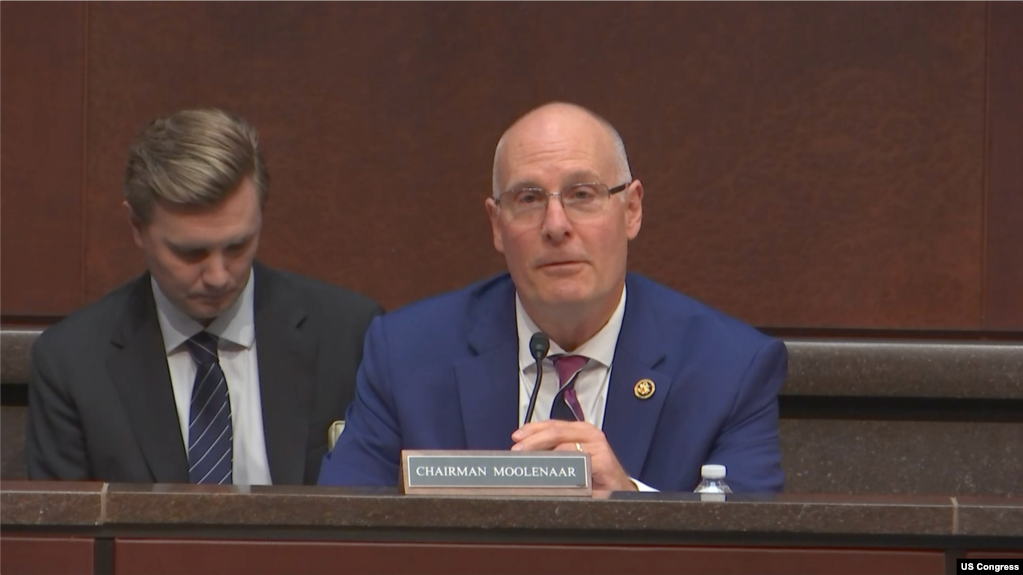 资料照片:美国众议院美国与中共战略竞争特设委员会的主席约翰·穆勒纳尔(John Moolenaar)众议员在《威权者与算法:为何美国必须在人工智能领域领先》的听证会上发言。(2025年6月25日)