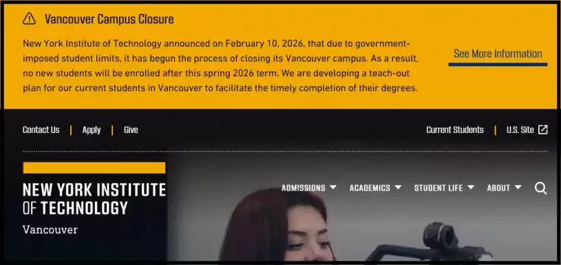 格伯同时也是纽约理工学院(New York Institute of Technology,简称NYIT)温哥华分校的副校长,他表示由于国际学生人数被削减,导致该校收入减少,要被迫关门。今年二月,NYIT宣布,温哥华分校的所有课程将在网上进行,以让已入学的学生继续上课,直至完成学业。在明年春季之后,该校将不再招收新生 (下图)。