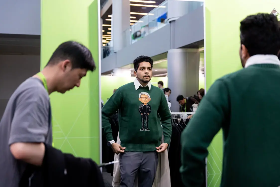 英伟达年度大会期间,哈迪克・纳哈塔在纪念品店试穿了一件有黄仁勋卡通形象的毛衣