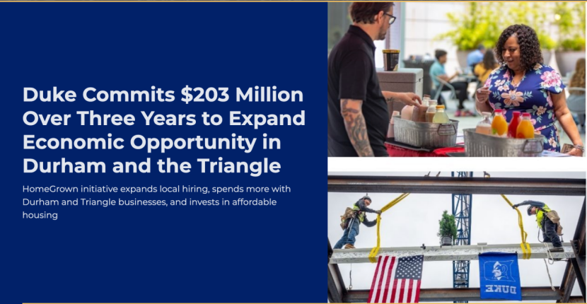 2026年3月,杜克大学与杜克大学医疗系统宣布,未来三年将向达勒姆及周边地区投入2.03亿美元,涵盖本地就业通道、本地企业采购、建筑合作机会和保障性住房建设四个领域。