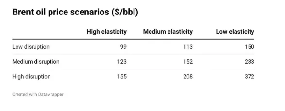 下表展示了在不同供应中断程度(低 、 中 、 高)以及需求对价格反应程度(高 、 中 、 低)下的多种油价情景 。 可以看到,价格区间非常广,从每桶 99 美元到 372 美元不等 。
