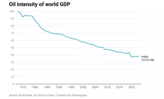 即使海峡继续关闭,如今全球经济对石油的依赖程度也远低于 1973 年 。 以下是全球 “ 石油强度 ” 指数,即每单位实际 GDP 所消耗的石油量,以 1973 年为 100。