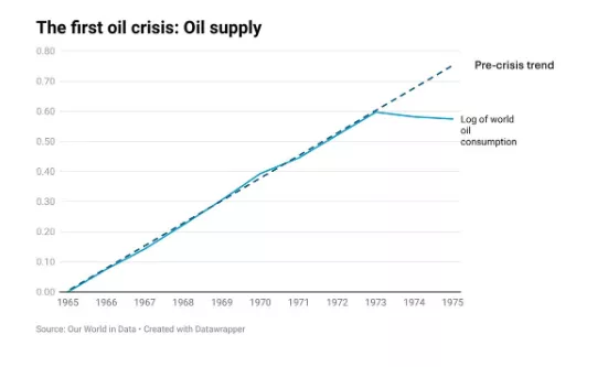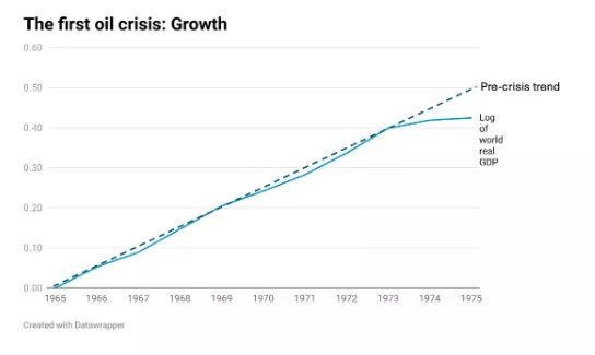 两个数字之间的百分比差异,大致等于其自然对数差值乘以 100。 因此,这张图显示,1975 年全球石油消费比按 1973 年前趋势计算的水平低约 17.5%,如果海峡持续关闭,这与当前可能出现的供应冲击规模相当 。