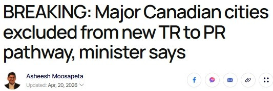 加拿大联邦移民部近日宣布,最新推出的临时居民转永久居民(TR 转 PR)移民通道将排除多伦多、温哥华、蒙特利尔等所有大城市。移民部长 Lena Diab 在 4 月 18 日接受"I'm Canada"YouTube 频道采访时明确表示,所有"人口普查都会区"(Census Metropolitan Areas,CMA)的居民都无法申请该政策。