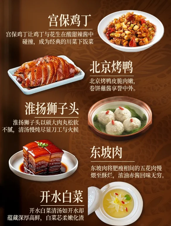 宫保鸡丁:糊辣荔枝口,鸡丁嫩滑,花生酥脆,丁宝桢家厨所创,川菜二十四味型中的“复合味”典范。