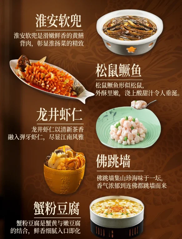 松鼠鳜鱼:炸后形似松鼠,浇糖醋卤汁吱吱作响,外脆里嫩,乾隆年间就已经成名,象征“富贵有余”。