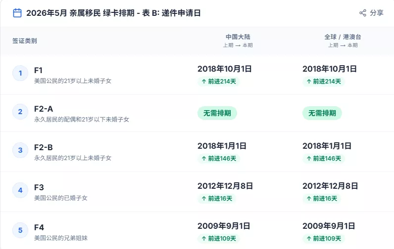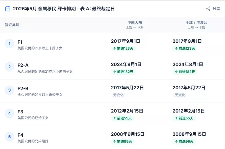 根据美国国务院最新数据,对于中国大陆出生申请人而言,2026年5月亲属移民表A(审批日期)具体如下——