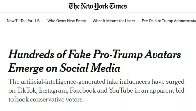 《纽约时报》截图 据纽约时报报道,人工智能生成的虚假网红在 TikTok、Instagram、Facebook 和 YouTube 上大增,目的明显是为了吸引保守派选民 。