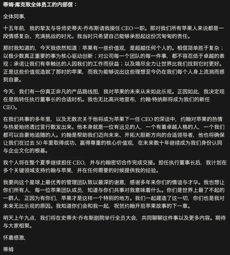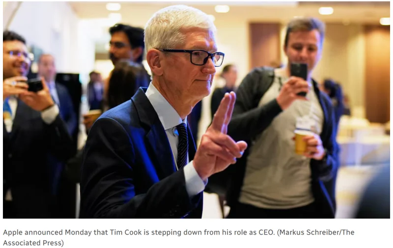 苹果突然官宣:CEO蒂姆·库克(Tim Cook),卸任了。