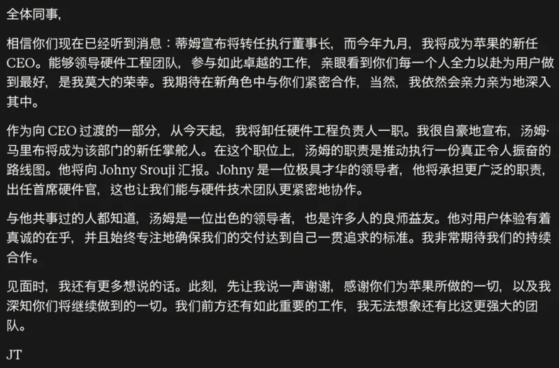 特努斯自己也发了封内部信。他写道:“领导硬件工程团队、亲眼看到每一个人全力以赴为用户做到最好,是我莫大的荣幸。”末尾他还加了一句“我依然会亲力亲为地深入其中”。