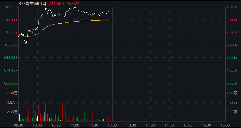 宁德时代盘中涨超6%,高见745港元,创上市新高。截至发稿,股价上涨5.55%,现报741.5港元,成交额12.83亿港元。