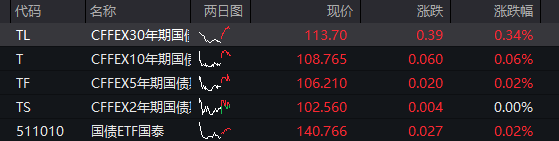 债市:国债期货全线上涨,截至发稿,30年期主力合约涨0.34%,10年期主力合约涨0.06%,5年期主力合约涨0.02%,2年期主力合约持平。