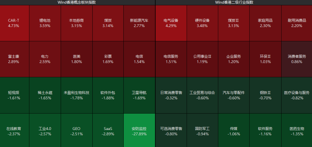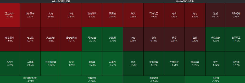 盘面上,个股跌多涨少,沪深京三市超3800股飘绿,全市场上午半天成交1.58万亿,沪深两市半日成交额1.57万亿,较上个交易日缩量1340亿。板块方面,算力硬件、半导体产业链回调,服务器、CPO方向领跌;AI应用、云计算、稳定币、特高压、消费电子概念股走弱。煤炭、电力、化工板块走强。