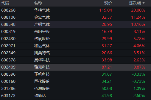 具体来看,工业气体概念逆势大涨,华特气体20cm涨停,金宏气体、广钢气体涨超10%。