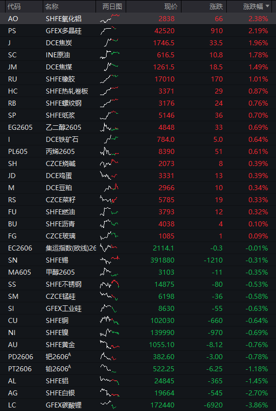 债市方面,国债期货全线走高。商品方面,国内商品期货分化,多晶硅高开之后回落,此前一个交易日涨停。核心市场走势: