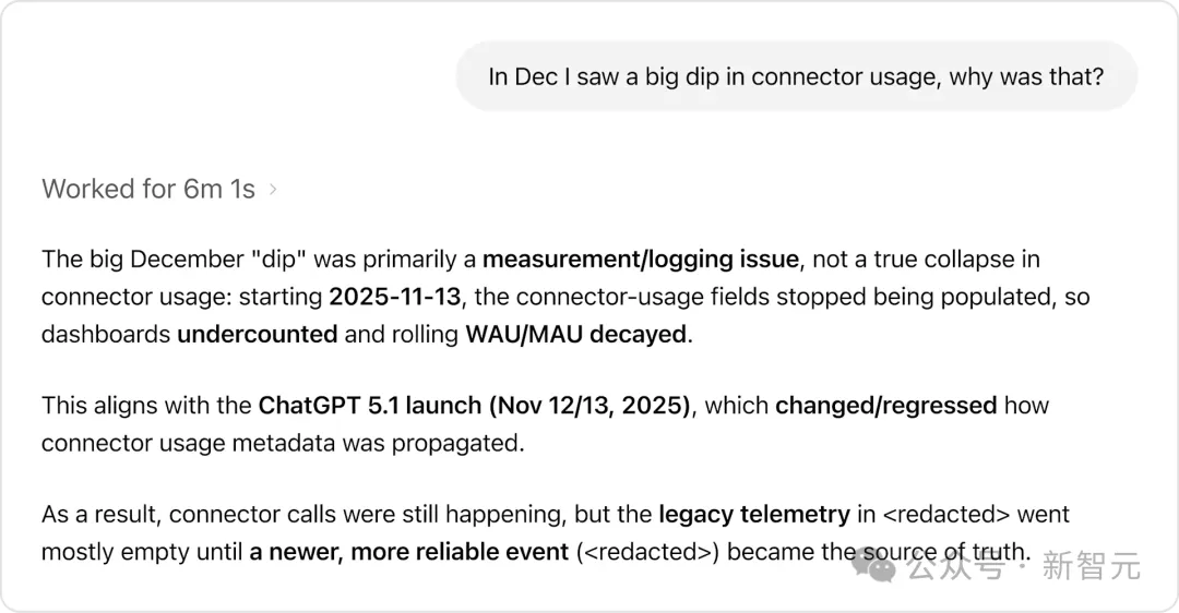 例如,当用户询问「12月连接器使用量为何大幅下降」时,智能体没有简单地报告数字下降,而是通过机构知识发现这主要是测量/日志记录问题,而非真正的使用量崩溃,与ChatGPT 5.1发布导致的数据收集变化相关。