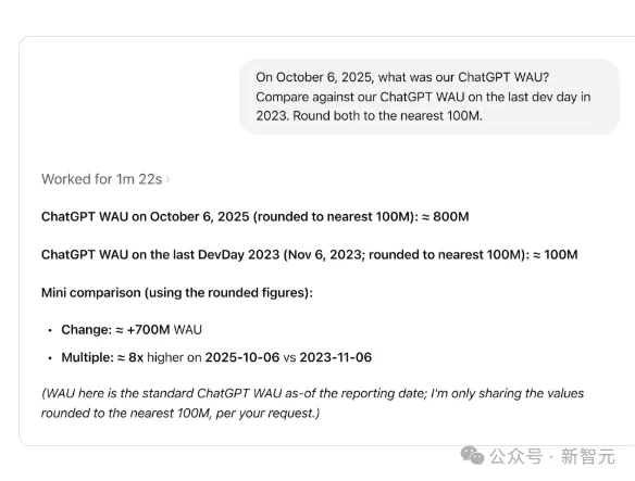 而现在有了由 Codex 驱动,具有自主学习能力的智能体,工程师不必写上百行的SQL查询语句,只需要提问就能从数据海洋中找到所需的信息,例如下图查询中要求对比两个时间点的活跃用户数。