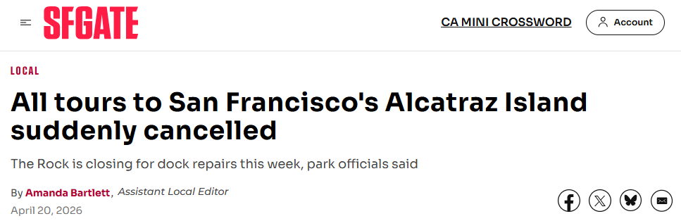 国家公园管理局(National Park Service)官员周一上午向SFGATE透露,旧金山的恶魔岛(Alcatraz Island)已关闭,将在本周禁止游客进入,以对码头进行维修。这座历史地标和旅游目的地计划于周六重新开放。
