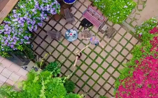 李若用无人机拍摄自家鲜花盛开的小庭院。(李若提供)