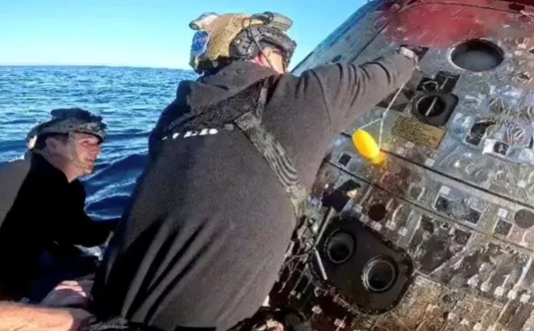 正如美国太空总署预测,阿提米丝2号太空舱于4月10日下午5点07分溅落海面。救援队在一艘小型充气艇上等待时机,太空舱借助几套降落伞缓缓下沉。