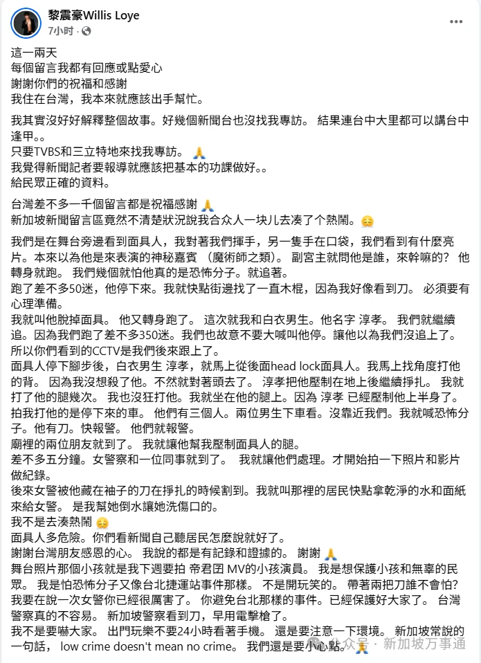 近日,新加坡歌手黎震豪在中国台湾旅居遇到可疑男子,追了对方足足3条街,最后帮警察抓住了嫌犯,自己也差点受伤…