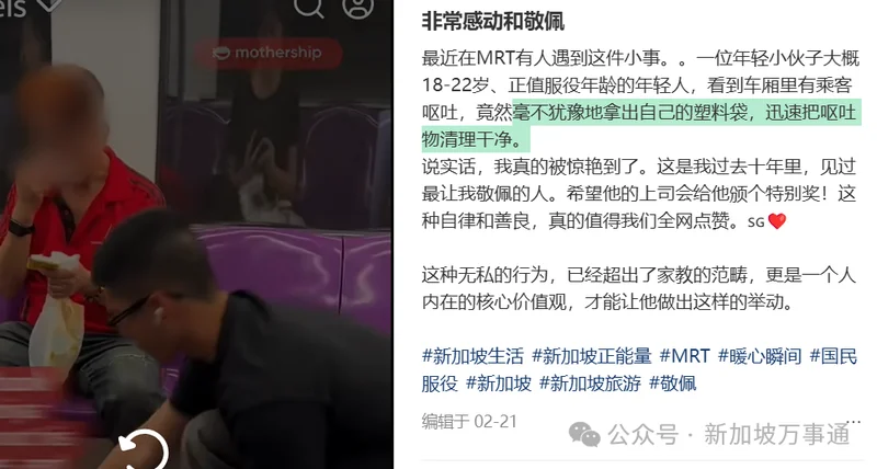 之前新加坡一年轻小伙看到有人在地铁里吐了,毫不犹豫地拿出自己的塑料袋,把呕吐物清理干净。