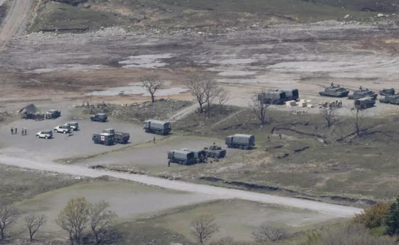 这张由共同社拍摄的航拍照片显示了日本陆上自卫队(JGSDF)位于日本西南部大分县的“比久代”演习场,4月21日,一辆坦克在该演习场发生爆炸,造成多名陆上自卫队队员死亡。 © via REUTERS - KYODO