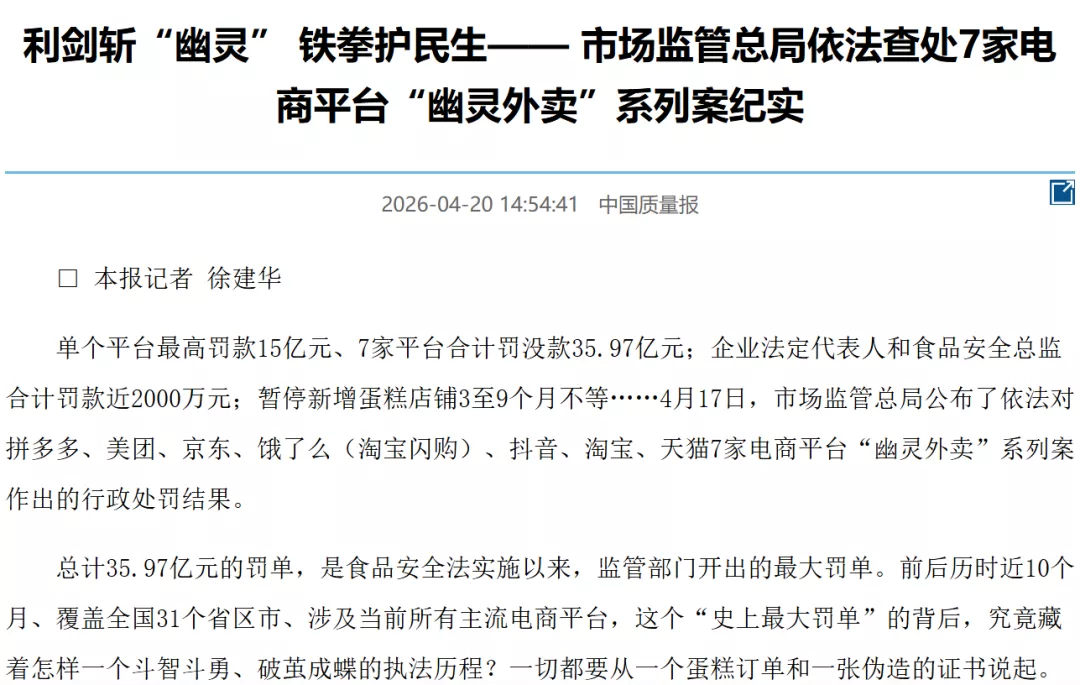 4月20日,《中国质量报》一篇头版新闻刷了屏。讲的是,过去近一年,市场监管总局查处7家电商平台“幽灵外卖”系列案纪实。