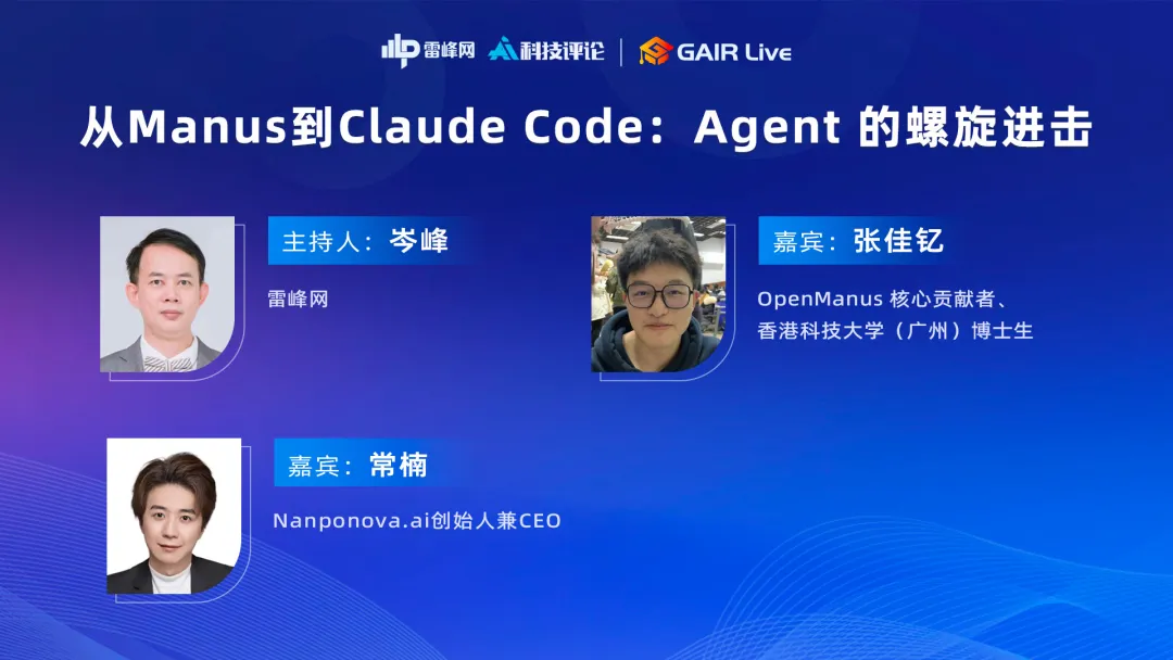 "这说明了Agent的演进不是线性的,而是螺旋式上升的。"在GAIR Live第27期的圆桌讨论中,OpenManus核心贡献者张佳钇这样评价。就在Claude Code发布的同一时期,Manus、OpenClaw、Codex等Agent产品密集涌现,整个行业仿佛在一夜之间进入了"深水区"。