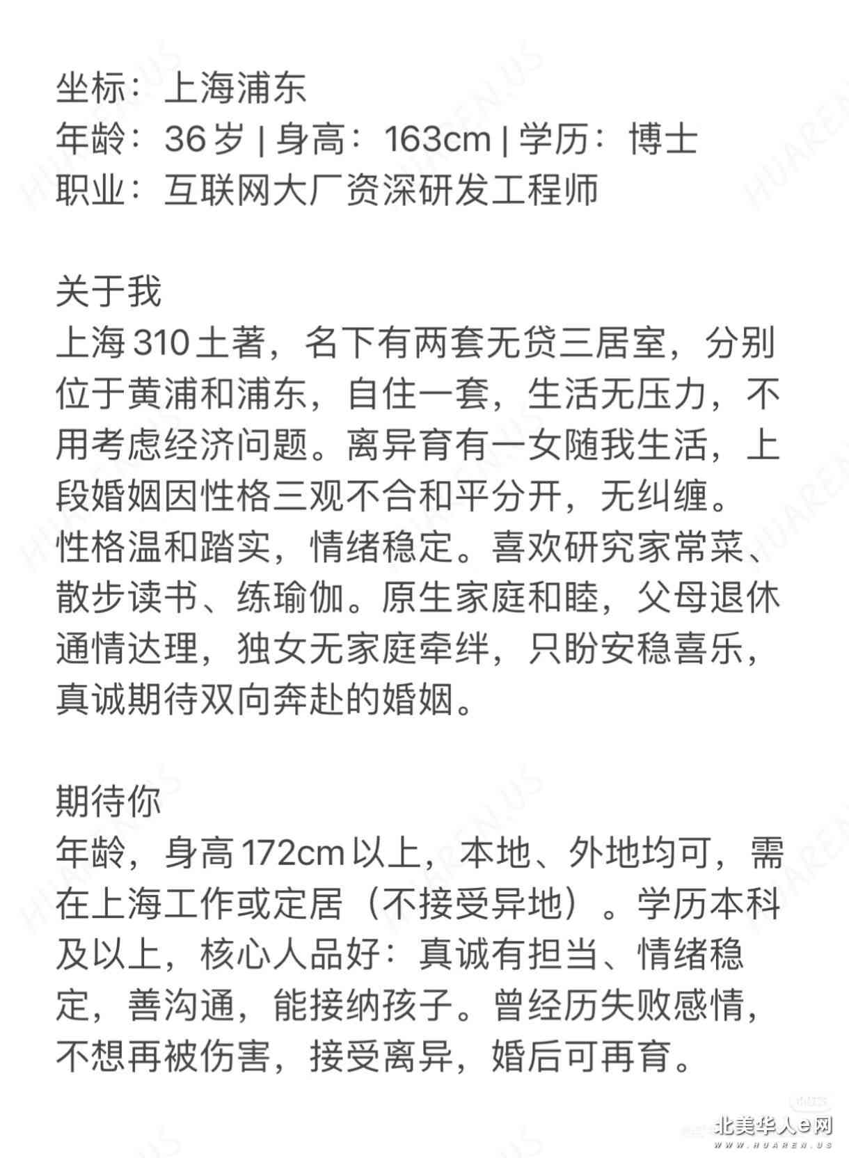 上海女博士离异征婚贴:36岁163cm华人生活网