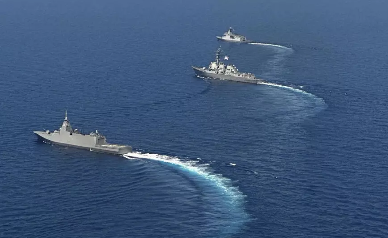 资料图片 在这张由菲律宾武装部队提供的资料照片中,从左至右依次为:日本海上自卫队(JMSDF)护卫舰“能代”号(JS Noshiro)、美国海军“肖普”号驱逐舰(USS Shoup,DDG-86)以及菲律宾海军“何塞·黎刹”号(BRP Jose Rizal)。2025年3月28日星期五,这三艘军舰在南海一处有争议的浅滩附近,参与了菲律宾、美国和日本三方联合海上合作活动并进行演习。 AP