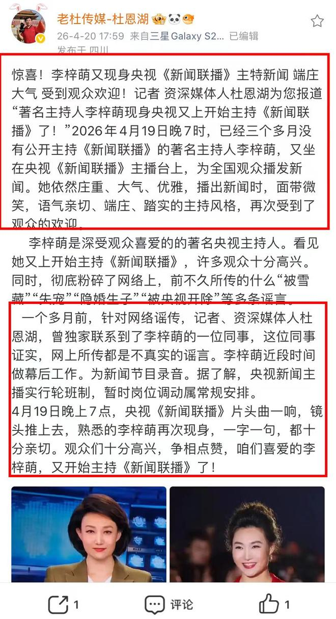 资深记者杜恩湖发文透露李梓萌回归央视晚间新闻报道,表示她已经三个月没有坐在新闻联播的主播台上。