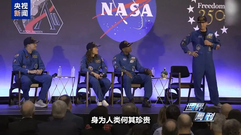 当地时间4月11日,在得克萨斯州休斯敦的美国国家航空航天局(NASA)约翰逊航天中心,刚执行完绕月任务的四名宇航员再度亮相。