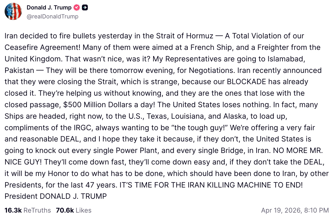 4月19日,川普发文写道:“我们正提供一份非常公平合理的协议,我希望他们会接受,因为如果他们拒绝,美国将会摧毁伊朗境内的每一座发电厂,以及每一条桥梁。绝不再做大好人……这是过去47年来其他总统早该对伊朗做的事。是时候终结伊朗这部杀人机器了!”(Truth Social截图)
