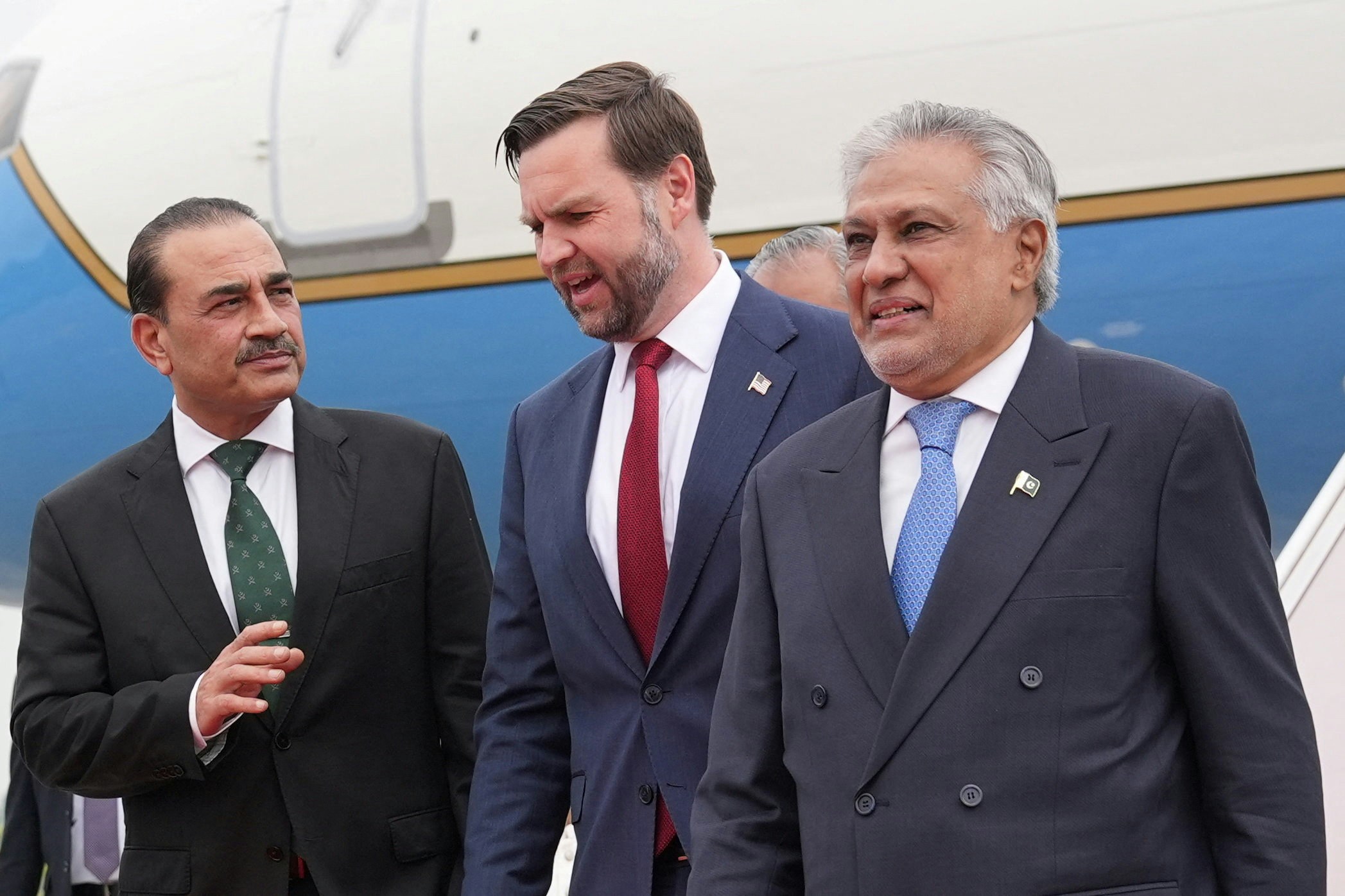 图为2026年4月11日,美国副总统万斯(JD Vance)抵达巴基斯坦伊斯兰堡,巴基斯坦陆军参谋长穆尼尔(Asim Munir,左)及巴基斯坦副总理兼外交部长达尔(Mohammad Ishaq Dar)接待。(Reuters)