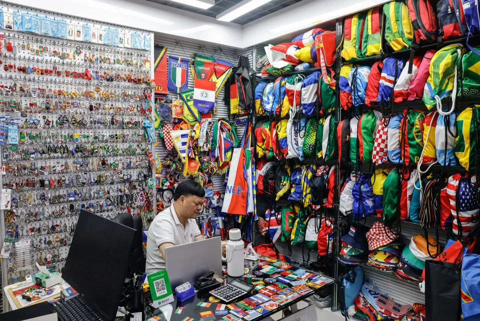 2026年4月19日,浙江义乌国际商贸城,一名商贩在店里检查世界杯主题相关商品。视觉中国图