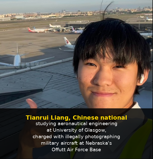据4月19日报道,梁天瑞就读于苏格兰格拉斯哥大学航空工程专业。他于3月底从加拿大入境美国,先后自驾前往南达科他州埃尔斯沃思空军基地(Ellsworth Air Force Base )与内布拉斯加州的奥福特基地(Offutt Air Force Base),寻找并拍摄军机。