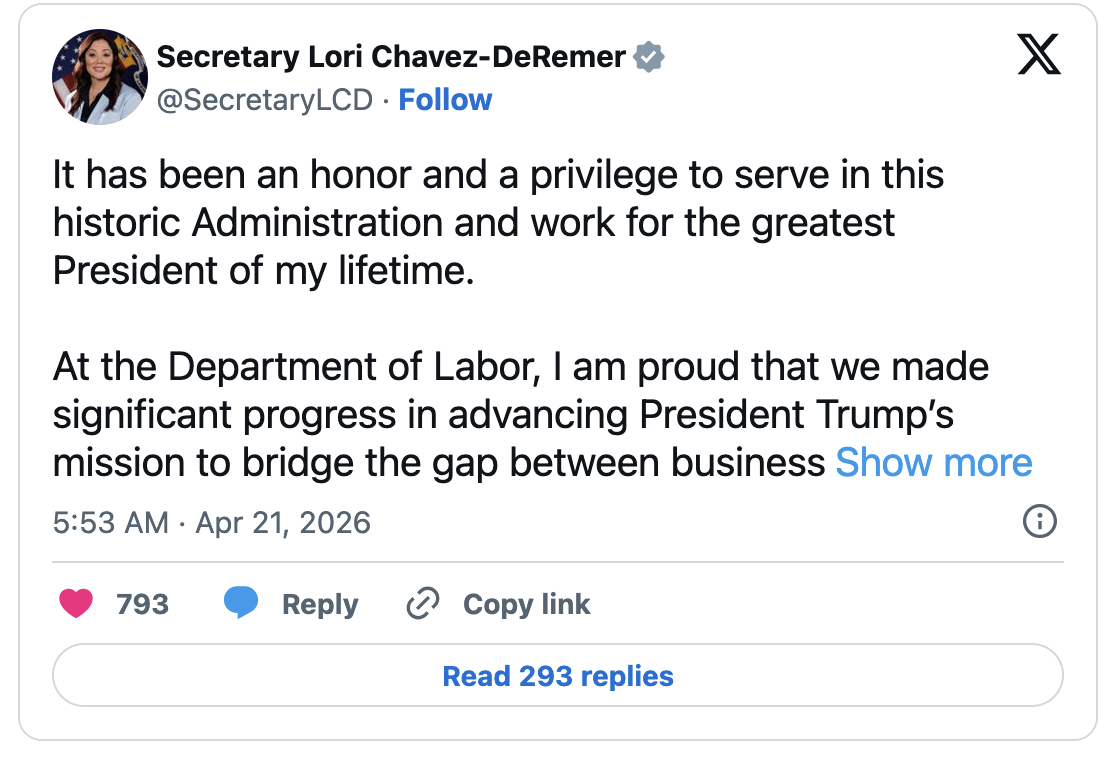 白宫4月20日宣布,劳工部长查韦斯-德雷默(LoriChavez-DeRemer)将离职,将转到私营部门任职;这是川普政府近期第三位离任的高级官员。白宫表示,德雷默在任内表现出色,保障工人权益,她离任后将由副手暂代其职。